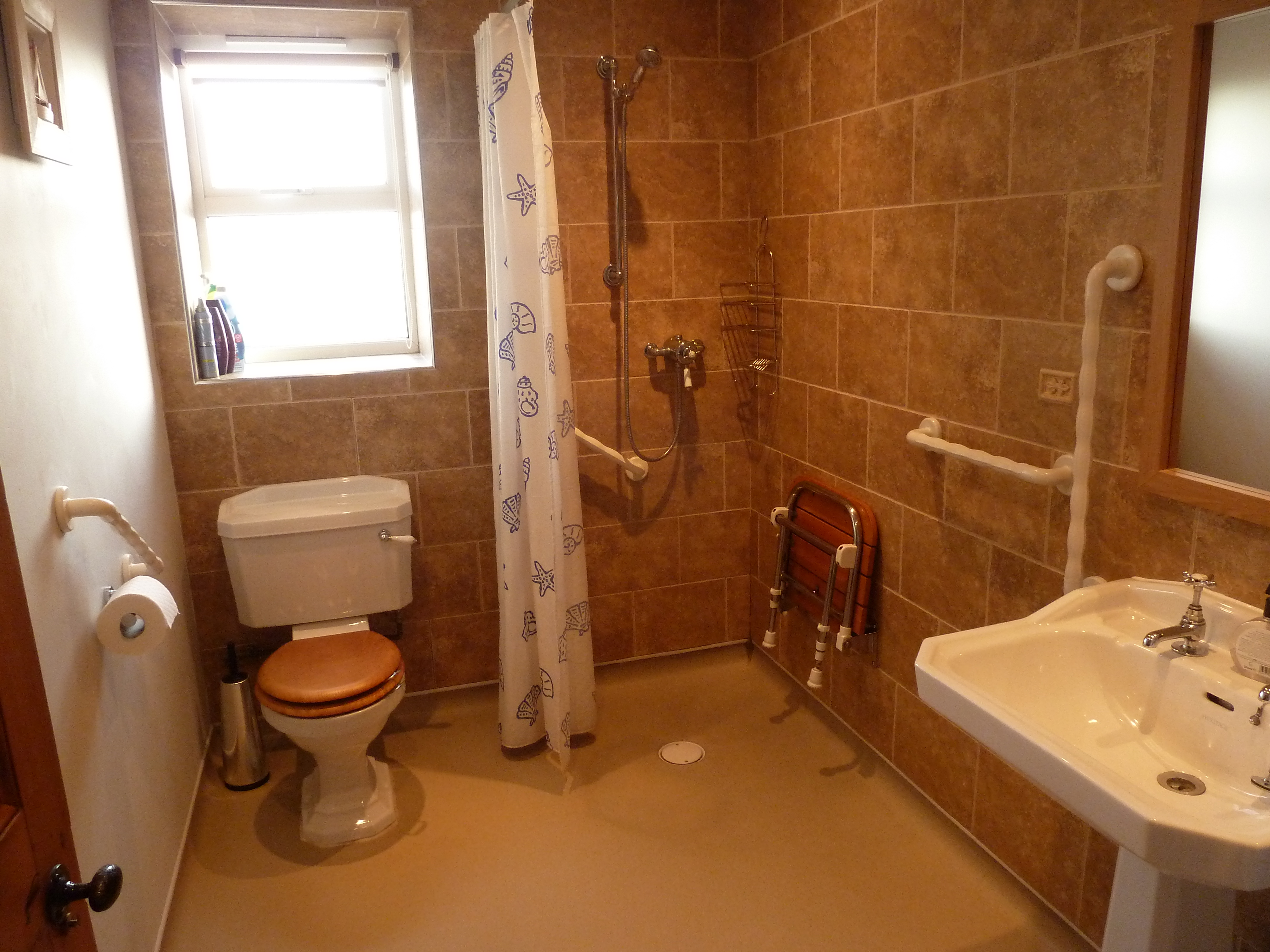 - Bathroom: The bathroom has a level access walk-in shower which is lever operated. There is a fold-down shower seat with legs. There is a grab rail by the toilet, in the shower and between the shower and sink. Sink taps are lever operated. Toilet seat raiser available on request.